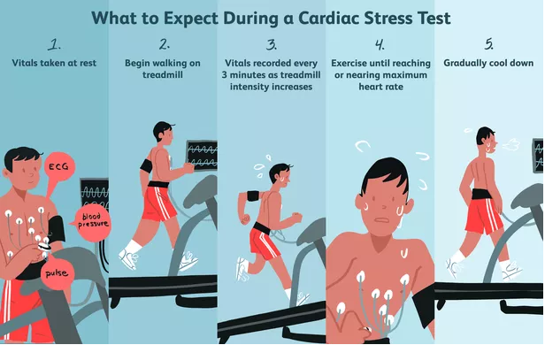 In a stress test, you walk on a treadmill that makes your heart work progressively harder. An electrocardiogram (ECG) monitors your heart's electrical rhythms. The doctor also measures your blood pressure and monitors whether you have symptoms like chest discomfort or fatigue. Abnormalities in blood pressure, heart rate, or ECG or worsening physical symptoms could point to coronary artery disease (CAD): fatty deposits (plaques) that reduce the flow of oxygen-rich blood to the heart muscle.